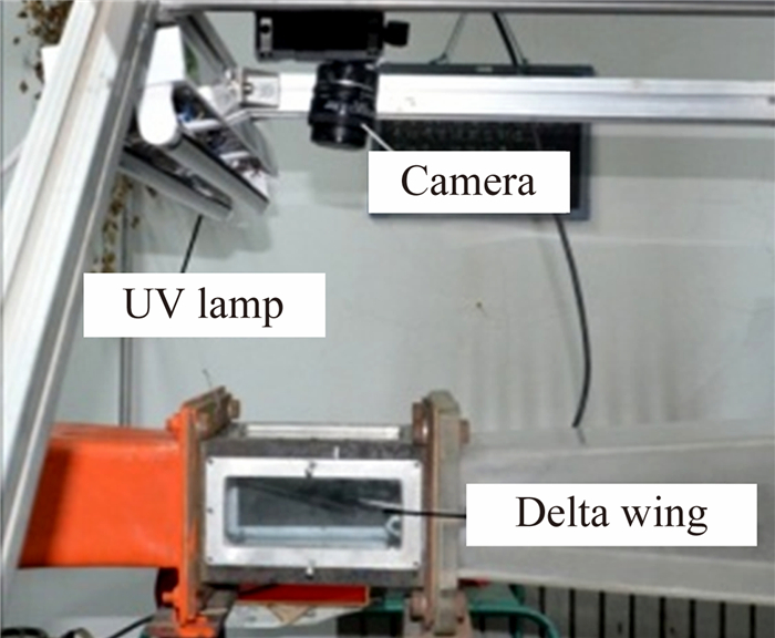 模型原型为65°后掠角、尖前缘的三角翼,模型高线长120mm,底边长112mm。实验在小型低速风洞内进行。风洞主体通过前段可控转速的涡轮风扇电机控制流动速度,通过调节变频器可以将流经中部实验段的流动速度控制在1~25m/s的范围内。采用CCD相机拍摄油膜灰度变化图像,采集频率为10fps。荧光染剂辐射波长为612nm(红光范围)。为尽量控制可见光射入,在相机前加600nm截止高通滤波片。采集结束后将数据传输到计算机上存储并处理。