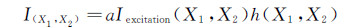 (3) 其中,Iexcitation(X1,X2)为平面上的激发光强,以下称Iex,a为荧光分子浓度和受激辐射效率的影响因子,将式(3)带入式(2)可得: