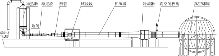 1 试验方法 1.1 风洞Φ1米高超声速风洞(图 1为风洞气动布局图)是目前国内最大的常规高超声速风洞。风洞喷管出口直径为1m,设计马赫数范围4~8,采用更换喷管的方式改变马赫数。风洞配有较完善的测控系统、多自由度模型机构、800mm直径彩色纹影显示系统等设备。该风洞采用高压下吹-真空抽吸运行方式,风洞总压运行范围较大,可通过改变风洞总压的方法实现雷诺数的变化,因此雷诺数模拟范围宽(见表 1),有利于开展高超声速飞行器雷诺数效应的模拟。