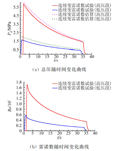 1) 高压段:加热器预充压力6.0MPa,总压变化范围约为1.4MPa~5.6MPa,雷诺数变化范围约为0.35×107~1.67×107。