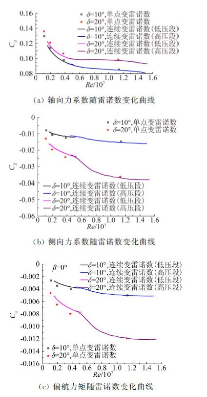 连续变雷诺数试验过程中保持模型姿态固定不变,即可获取一定姿态角条件下模型气动力随雷诺数的变化规律。