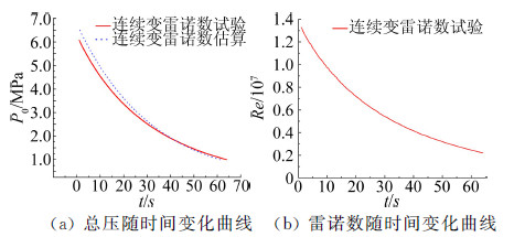 开展弹头模型变雷诺数试验时,Φ1米高超声速风洞配套的真空系统已扩容至10000m3。根据前述的连续变雷诺数试验风洞运行时间估算,单车次试验得到的总压、雷诺数变化范围可完全覆盖单点变雷诺数试验流场条件。其总压、雷诺数随风洞运行时间变化曲线如图 5所示。