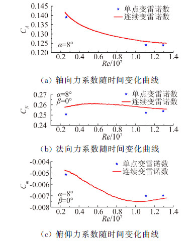 2) 与单点变雷诺数试验相比,连续变雷诺数试验可获得更多的试验数据信息,能最大限度地得到风洞试验能力范围内的飞行器气动力随雷诺数的变化规律(包括非线性变化等)。