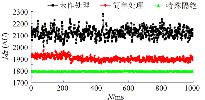 机构振动过程中,对天平信号的主要干扰是驱动电机。电机对天平信号的干扰很强,地面振动试验中可以看出,不对电机干扰进行任何隔绝处理的话,天平输出信号很乱,几乎看不出明显的波形。经过一些特殊的隔绝处理之后,电机对天平信号的干扰可以大大降低,图 6给出天平俯仰力矩元信号在不同情况下的波动情况,可见经过特殊隔绝处理之后,天平信号的波动量大大降低。