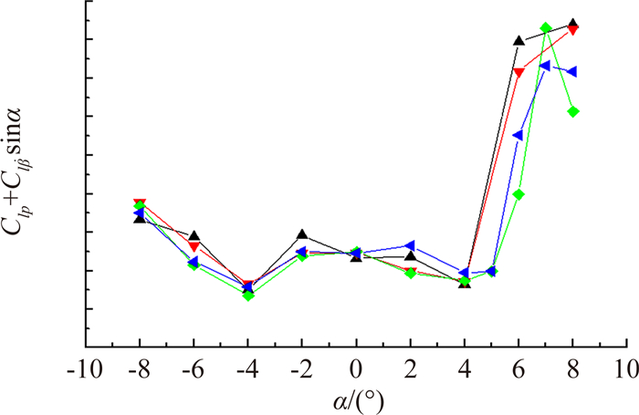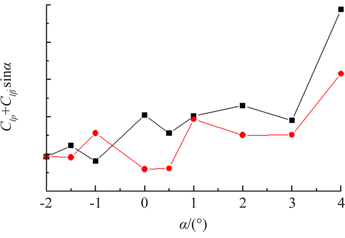 | 图 7 Ma=0.8, f=12导弹滚转阻尼导数试验结果(本期) Fig. 7 Ma=0.8, f=12, dynamic stability derivatives of the missile model (present) |