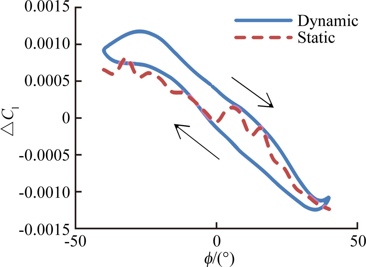图 11中给出滚转振荡频率0.6Hz动静态支架干扰滚转力矩增量。从图 11中可以看出,与图 9(1.5Hz)比较,支架干扰影响规律基本一致,差别在于,迟滞环面积变小。
