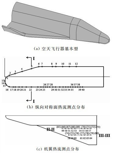 图 1 空天飞行器外形及热流测点分布 Figure 1 Aerospace configuration and aerodynamic heating test point distribution |