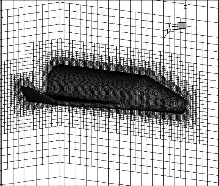 2 工程快速计算理论 2.1 基于直角网格的无粘欧拉方程计算理论计算的流场区域取为大的长方体, 图 2为计算的直角网格。为了在物面附近加密网格,找出与物面相碰的单元,这里不仅将相碰的单元等分为8个单元,而且将其邻居以及邻居的邻居等等也划分为8个, 如此形成第2层加密网格。再对第2层网格做上述自适应加密, 形成第3层加密网格。继续上述过程, 可以形成近壁面的多层加密网格。