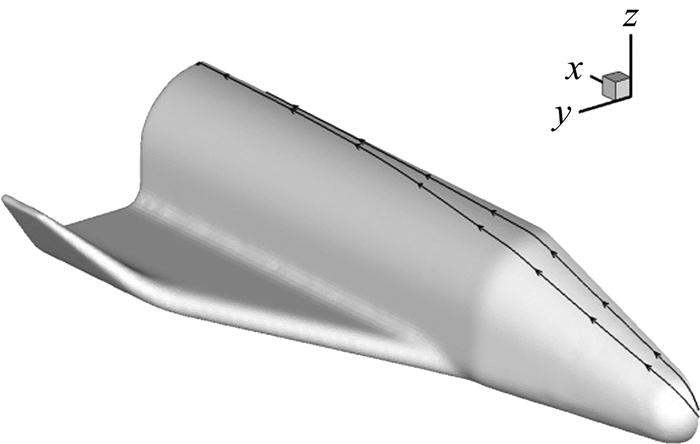 2.2 表面流线生成方法基于上述计算理论,考虑某一时刻t的速度场,在飞行器表面取任一点P0(x, y, z, t),首先找到与该点最近的物面法向第一层的网格编号C0,将网格C0格心P1存储的速度V(x, y, z)作为下游流线上P1点的切线方向,并取该网格步长dh作为流线的积分步长。在距离P1(x, y, z, t)点V(x, y, z)*dh范围内寻找一与C0邻近网格格心点P2(x, y, z, t),若P2(x, y, z, t)与P1(x, y, z, t)坐标向量与P1点的速度矢量形成的夹角最小且不大于60°(若无满足条件的点则作为流线的终点),则将P2点作为下游流线的第二点,以此类推求出下游流线上的各点,得到一条折线,记为经过飞行器表面P0点的流线;P0点上游流线求法类似。图 3为利用本文建立的方法得到的空天飞行器的表面无粘流线示意图。