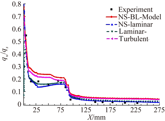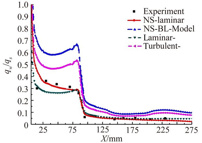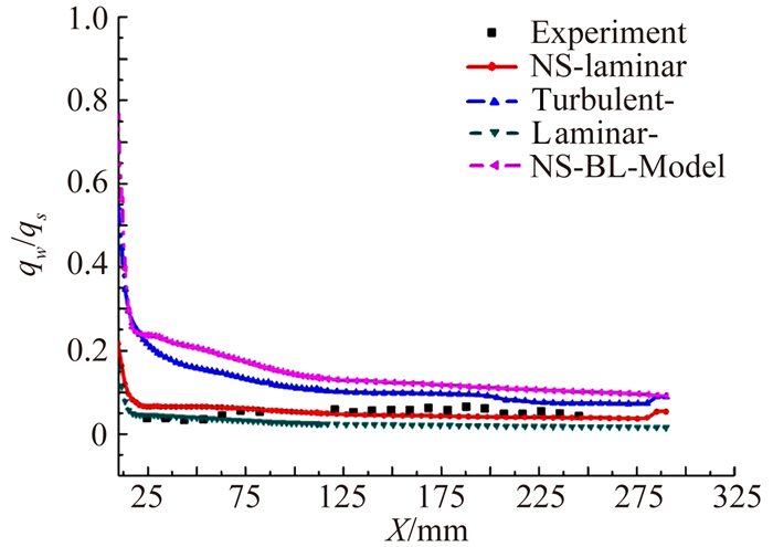 图 5为通过工程方法、数值方法得到的机身纵向对称面下表面热流分布与试验数据的对比(图中laminar-,表示层流气动热的工程计算;turbulent-,表示湍流气动热的工程计算;NS-laminar,表示层流模型数值计算;NS-bl,表示bl湍流模型数值计算)。迎角0°时,下表面是背风面,采用工程方法及数值方法,都可以揭示热流的变化趋势,在两种方法中采用湍流模型的计算结果明显高于无湍流模型的结果。因为实验数据是在层流状态下的气动热,层流的计算结果与实验数据比较吻合,且数值计算的结果比工程方法更接近于实验值。图 6为纵向对称面上表面热流分布,数值与工程方法及实验数据在后半段吻合较好,前半段差别较大。层流的数值计算结果明显优于工程方法,且数值方法与实验数据吻合较好。Ma=10.2得到的纵向对称面热流分布如图 7所示。