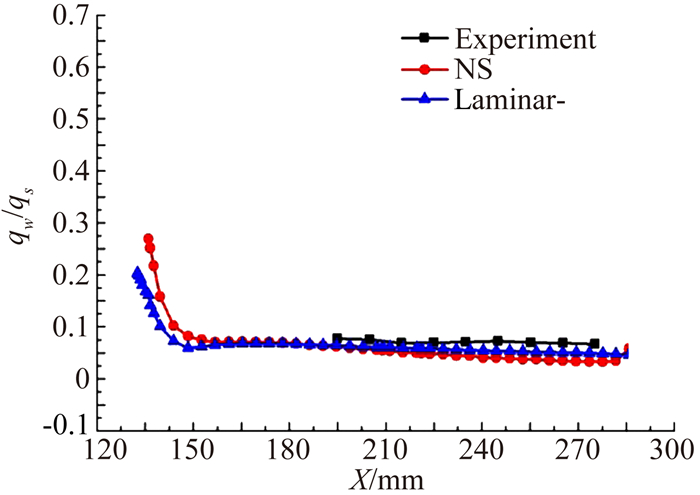 图 7 Ma=10.2纵向对称面上表面热流分布 Figure 7 Leeward centerline heating data comparison for Ma=10.2 |