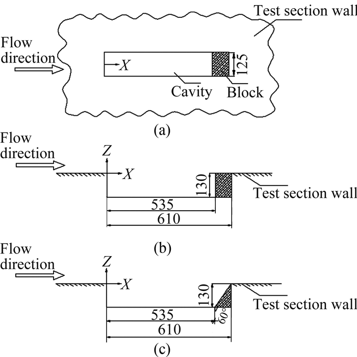 1.2 模型试验模型安装在FL-24风洞特种试验段右侧壁上(顺气流),模型结构示意图如图 1。空腔长度(L)为0.535m、0.610m,宽度(W)为0.125m,深度(D)为0.130m,其长度变化通过在空腔后端添加堵块实现。进行流动控制后,空腔后壁与底板之间的夹角为60°(图 1(c))。