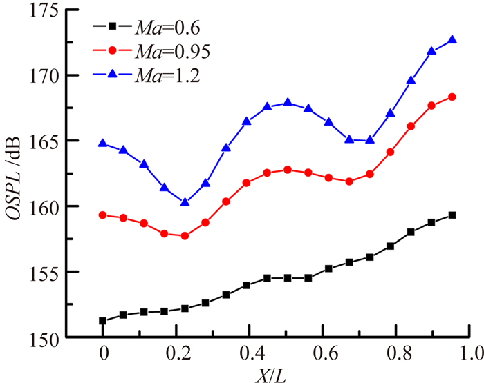 图 2表明,Ma=0.6时总声压级沿纵向呈单调缓慢增大趋势,这主要是由空腔三维效应造成的,由于空腔宽度较小(D=0.125m),加之Ma相对较低,空腔前后端三维效应明显,空腔前缘的三维效应使空腔上方的剪切层较早转化为一种相对稳定的状态;另外,空腔侧壁附面层相对较厚,降低了空腔内部流场对外界扰动的感受性,故空腔流场气动噪声强度较低,且呈单调变化。Ma=0.95、1.2时,总声压级沿舱底纵向分布波动较大,其分布规律相似,此时,空腔三维效应及侧壁影响明显降低,曲线存在两处急剧上升点,其对应空腔上方剪切层特性的变化,第一个上升点对应为涡配对的位置,剪切层内压力脉动显著增强,第二个上升点对应为流动演化为小结构湍流涡区的位置。与Ma=0.6相比,空腔流场气动噪声强度显著增加,Ma=1.2时,空腔流场的主噪声源总声压级量值约为173dB,与Ma=0.6相比增大了近13dB,这主要是因为,随Ma数增大,气流动能增加,剪切层内气流脉动强度增大,另外,剪切层在空腔后壁上撞击强度的增加也加剧了气动脉动。