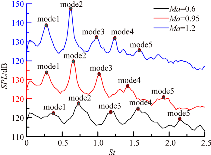 图 3表明,不同Ma下,声压频谱曲线上均存在多个明显的能量尖峰——即对应不同模态的单调声,这意味着空腔流场存在有周期性自持振荡;Ma=0.6时,由于腔内对外界感受性较弱,故部分模态声压峰值不明显;随Ma增大,空腔流场前四阶模态声压峰值均更明显,其强度也显著增大,相同模态对应的St略有减小;试验Ma范围内,空腔流场前五阶自持振荡模态均在St<2.5范围内,从St定义可知,空腔长度越大,其气动声学能量越向低频方向集中。