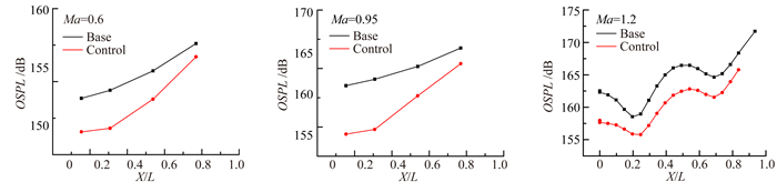 图 4给出了不同Ma下,采用斜后壁进行流动控制时对空腔底部测点总声压级分布影响。基准状态对应图 1(b)构型,进行纵向位置无量纲化时,选取参考长度L均为0.535m,空腔长深比为4.1。
