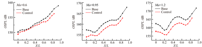 图 4表明,与基准状态相比,流动控制后,空腔底部所有测点的总声压级强度均明显降低,随Ma增大,腔内最大总声压级降低幅度增加,Ma=0.6时,空腔后壁附近总声压级强度约降低3dB,而Ma=1.2时,腔底最大总声压级从172.7dB降低为165.8dB,减小了近7dB。