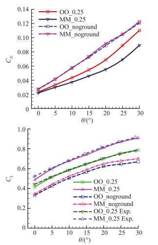 图 2为h/c=0.25和自由流的OO机翼和MM机翼的阻力、升力系数随副翼偏转角变化曲线。自由流下,两种不同组合的机翼阻力系数随副翼偏转角基本呈线性变化,随着副翼偏转角增大而增大;地效区内机翼阻力系数偏小。随着副翼偏转角增大,诱导阻力减小的效果更加明显。对于机翼的升力系数,两种不同中心板和端板组合的机翼的升力系数均随着副翼偏转角增大而增大,和文献[11]的实验值也基本吻合。