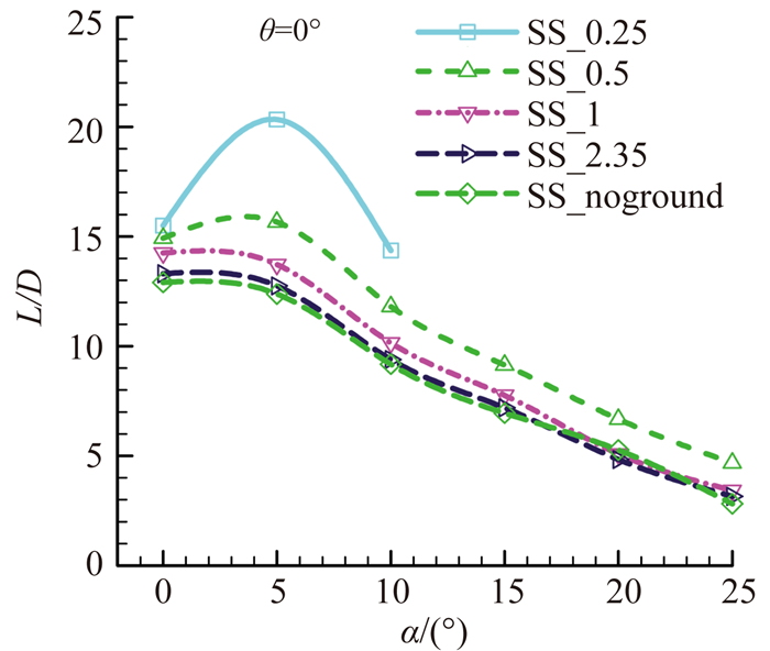 图 3 升阻比随迎角变化曲线 Figure 3 Angle of attack and ground effects on lift-to-drag |