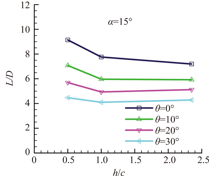 为了进一步研究机翼的迎角特性和高度特性,本节继续对不同相对高度下机翼升阻特性进行了数值模拟。θ=0°时,不同相对高度机翼升阻比随迎角的变化见图 3。地效区内,机翼的最大升阻比出现在α=5°左右。在相对高度较大(h/c≥1) 时,机翼的地面效应影响很弱,基本和自由流的机翼升阻比接近。图 4为α=15°下不同副翼偏转角的升阻比随相对高度变化曲线,从图中可以发现,h/c≥1时,升阻比基本不随相对高度的变化而变化,进一步验证上述结论,这说明相对高度在一倍平均弦长内,地面效应影响较强;超过这个区域,地面效应逐渐减弱,这和文献[11]的实验结果相同。