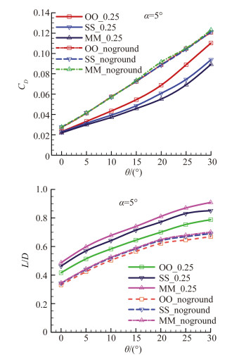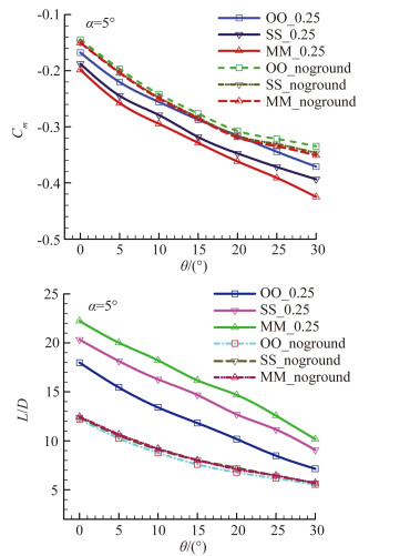 图 6 俯仰力矩系数和升阻比随副翼偏转角变化曲线 Figure 6 Effect of plates and flap angle on pitching moment coefficient and lift-to-drag ratio |