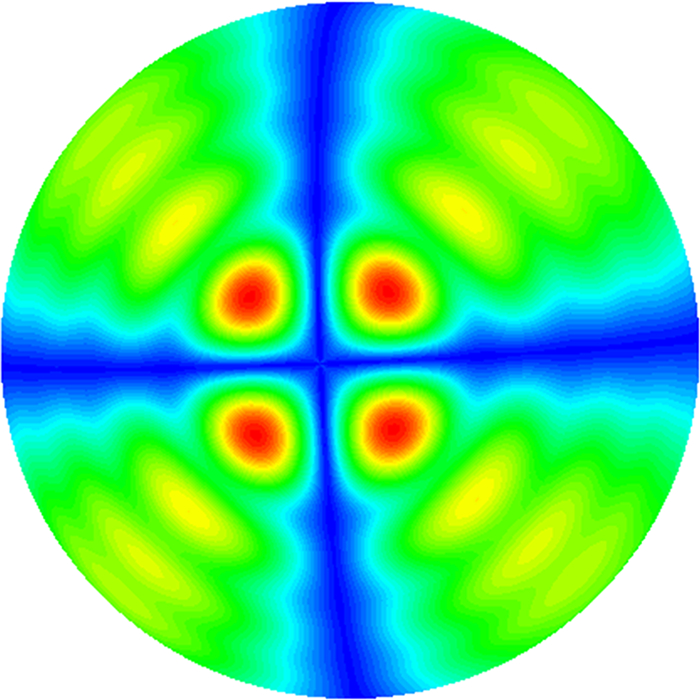 图 2 表面散射电磁场等值线云图(ka=10) Figure 2 Contour of surface scattering field(ka=10) |
