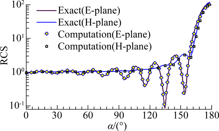 2 计算结果与分析 2.1 并行化多块FVTD程序pmbRCS3d验证多块网格FVTD程序mbRCS3d,并行化扩充为pmbRCS3d。首先选择带解析解的金属球(ka=10,其中k为波数,a是半径)为验证目标。