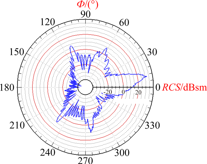 图 8 双站RCS分布(f=1.2GHz, 平行极化) Figure 8 Bistatic RCS profile(f=1.2GHz, parallel polarization) |