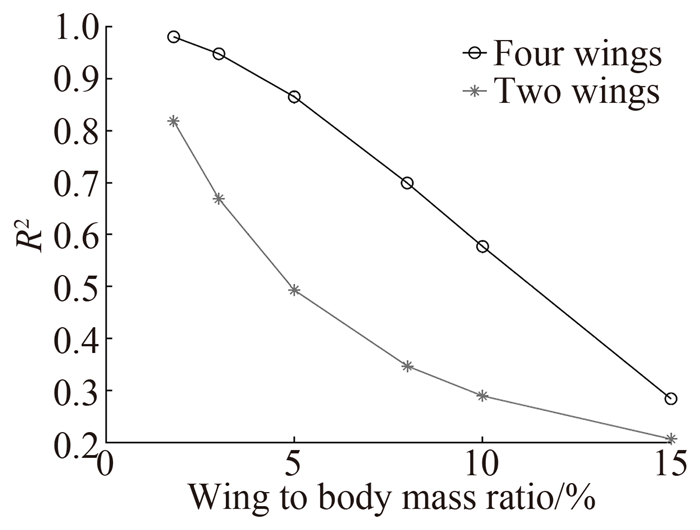 由图 7可知,具有对称扑动的四翼布局的相关系数比传统布局的两翼布局的要高,说明单刚体动力学模型在四翼布局的适用范围要广,这是因为四翼布局的飞行器在扑动过程中会产生对称的垂直于机体轴线方向的力,由于方向相反,会相互抵消,从而减少扑动翼的惯性力对机体运动的影响。