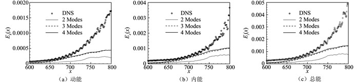 如图 11(a)所示为DMD的特征值,由SPDMD选出的模态用○圈出,散点的颜色表示模态能量的大小。这些模态都是分布在单位圆上的,即时间上是中性稳定的。图 11(b)中进一步展示了DMD的频谱。可见SPDMD选出的主要模态在频率上可以分为三个分支,一是低频的分支,集中在Im(w)=0附近,二是中等频率的分支,集中在Im(w)=0.6附近,三是高频的分支,集中在Im(w)=1.4附近。我们按能量大小对模态进行排序,并取2~4阶模态对流场的扰动能量进行重构,如图 12所示。计算结果表明,在模态分析的区域内,扰动内能大于扰动动能,用3~4阶模态就可以较好地预测扰动能量随流向的变化。