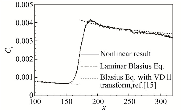 图 4 壁面阻力系数曲线(Ma=6) Figure 4 Profile of skin friction (Ma=6) |