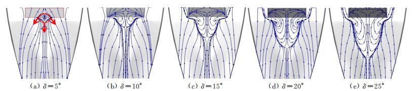 图 6 不同偏转角下控制翼附近极限流线 Figure 6 Surface limiting streamlines with different angles of deflection |