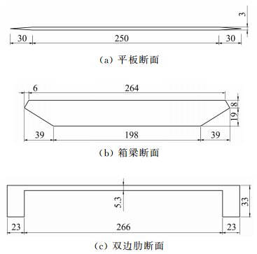 2 CFD数值模型 2.1 数值计算方法本文数值计算采用三种不同流线程度的断面,分别为:宽高比B/D=103:1的平板断面,流线型的箱梁断面和钝体的双边肋断面。具体的断面形式如图 1所示。