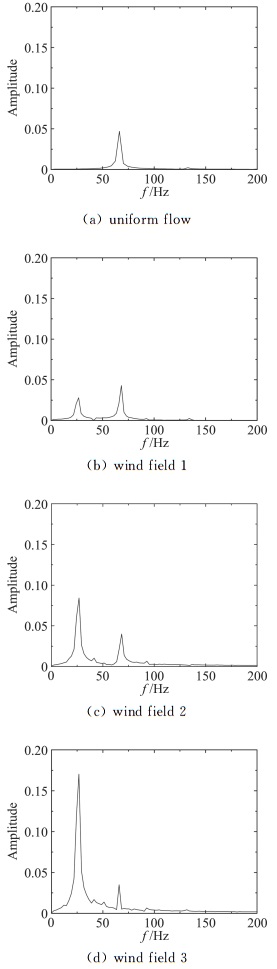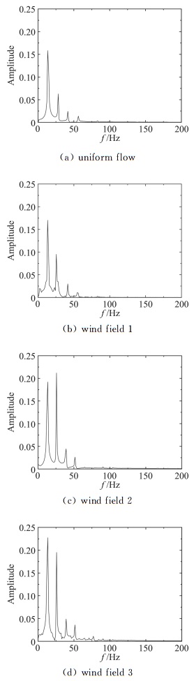 平板断面因其流线性质,升力时程只包含来流简谐脉动引起的气动力,对应的卓越频率为25.82Hz。箱梁断面的尾部会产生周期性的旋涡脱落,从图 14可知,在均匀来流下因旋涡脱落引起的升力脉动的频率为66.4 Hz。双边肋断面的几何外形复杂,在它周围的流动现象也更为复杂。从图 15可知,双边肋断面的升力时程信号包含有四个显著的峰值,对应的频率分别为:f1=13.4Hz、f2=28.1Hz、f3=41.5Hz、f4=56.2 Hz。从图 15也可以看到,频率f2因与来流的脉动频率(25.82 Hz)接近,因此按频率f2脱落的旋涡诱导的气动力会对来流简谐脉动引起的气动力产生干扰,从而使该频率处对应的气动力不再满足叠加原理。