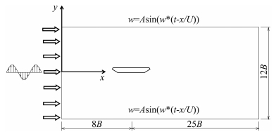 模型的计算域如图 2所示。对于简谐脉动来流,计算域的左侧采用速度入口边界条件,水平向速度分量u不随时间变化,竖向速度分量w为正弦脉动;计算域的上下边界也采用速度入口,竖向速度除了随时间变化以外也是空间的函数,以保持与左侧的速度进口相协调。对于宽频湍流来流,计算域左侧的速度入口,水平速度与竖向速度都采用宽频的人工合成湍流;计算域的上下边界采用对称边界条件。右侧的出口都采用压强出口条件。