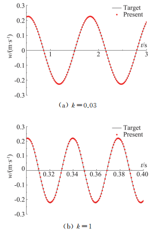 图 4所示为k=0.03和k=1时,无障碍流场中坐标(x, y)=(8B,0)处,简谐脉动速度时程与目标值的比较。从图中可以看到,在低折算频率与高折算频率下模拟值与目标值吻合良好,说明采用以上的数值设定可保证来流的自保持特性。