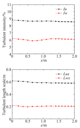 图 5 湍流度和积分尺度沿x轴的变化(y=0) Figure 5 Turbulent intensity and turbulent length scale along the x-axis (y=0) |