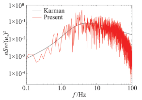 图 6 坐标(x,y)=(8B,0)处竖向脉动速度功率谱密度 Figure 6 Power spectrum of the vertical gust at (x, y)=(8B, 0) |