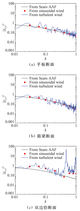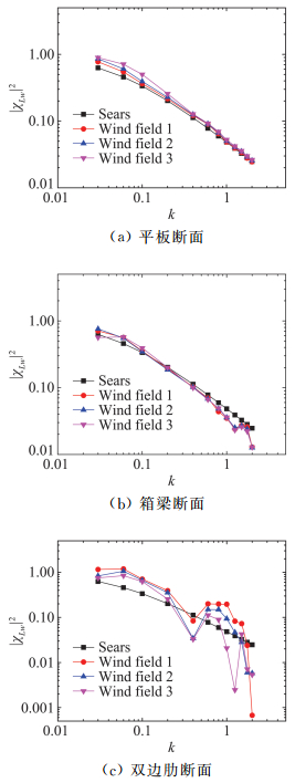 图 8 升力气动导纳函数|χLw|2 Figure 8 Aerodynamic lift admittance functions |χLw|2 |