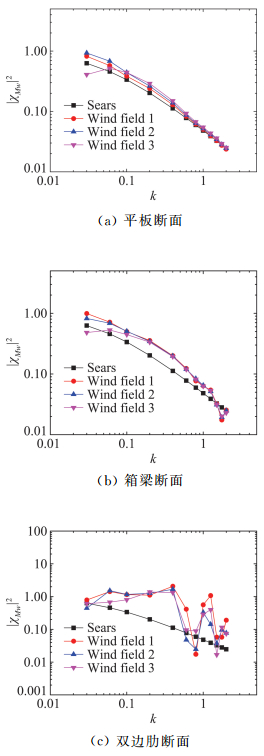 其中,SL和SM分别为升力和扭矩的功率谱密度;Sw为竖向脉动风的功率谱密度;|χLw|2和|χMw|2为升力和扭矩关于竖向脉动风的气动导纳。