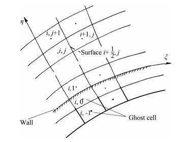 1.2 空间项离散应用有限体积法,以网格单元为控制体,对控制方程进行离散。在有限体积法中,流场变量储存在单元格心,在单元内部均匀分布。本文记流向为ξ,下标索引为i;法向为η,下标索引为j。把控制方程(1)在控制体(i, j)积分,并应用Gauss-Green定理,则有: