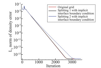 下面考察在法向进行网格分块对算法性能的影响。图 10是对二维球头绕流网格在法向进行分块的分块位置示意图,本文分别考察在两个分块位置分块后形成的多块网格流场的收敛性能,其中分块位置1(splitting 1)远离边界层,分块位置2(splitting 2)位于边界层内。图 11展示了二维球头绕流网格在法向分块后得到的多块网格流场收敛曲线,由图可见,在分块位置1进行网格分块对收敛性能影响较小,但在分块位置2进行网格分块降低了算法的收敛性能。分析原因,相较于分块位置1,分块位置2在边界层内,流场法向梯度大,相邻法向网格单元之间流场变量耦合紧密,而DPLR算法在分块后的两个块上分别求解使得两个网格块流场变量联系得不那么紧密,收敛速度下降是必然的。需要说明的是,DPLR隐格式不是无条件稳定的[8],在初始网格求解时CFL数可以取到3000(图 6,图 8),在分块位置2分块后CFL数最大只能取到1800(图 11),这说明分块后格式稳定性下降。图 11中网格分块后流场的DPLR计算,采用本文提出的隐式对接边界条件(见式(13),图中标注为“implicit interface boundary condition”),而不采用隐式对接边界条件即直接舍弃与虚拟网格点有关的项,算法CFL数最大可取到100,收敛很慢,在图中未给出。