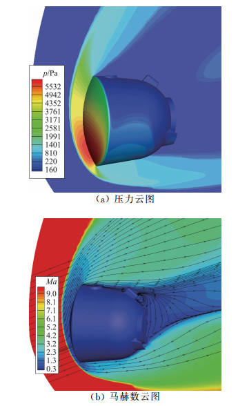 图 15 返回舱在风洞试验状态的流场(α=22°) Figure 15 Flowfield around reentry capsule at wind tunnel test condition (α=22°) |