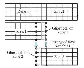 对于整个求解区域的外边界,显示边界条件可应用式(10)。例如,对于超声速入口,直接给出φ0=φ∞,其中“∞”表示自由来流;对于超声速出口,φb=φ1;对于绝热壁无滑移物面,Pb=P1,ub=0,vb=0,Tb=T1;对于等温壁无滑移物面,Pb=P1,ub=0,vb=0,Tb=Tw。其中,P、u、v、T分别表示流场压力、x方向速度分量、y方向速度分量和温度。对于相邻网格块之间的对接边界(见图 2),虚拟网格上的流场变量φ0从与之对接的网格块内点直接得到,φ0和φ1之间没有类似式(10)的函数关系。