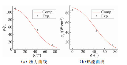 对于二维球头绕流,本文把计算得到的物面无量纲压力和热流(与驻点值的比值)分布与Wieting试验结果[17]比较(见图 4),两者吻合较好。对于三维球头绕流,本文把计算结果和Coleman的试验结果[18]比较,并如图 5所示。由图可见,本文计算的三维球头物面压力(与自由来流值的比值)、热流分布与试验吻合较好。