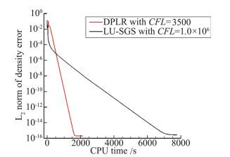 收敛快是DPLR算法的特点之一,Wright在这方面已经做了详尽的研究[8]。对于二维球头和三维球头算例,本文把DPLR与LU-SGS算法的收敛曲线进行对比,分别如图 6和图 7所示,其中横坐标是CPU时间(Intel Core i7-4790单核)。由于DPLR不是无条件稳定格式[8],在应用DPLR格式中这两个算例的CFL都取为能够使计算正常进行并保证收敛的最大CFL数,其中二维球头绕流算例CFL数取为3000,三维球头绕流算例CFL数取为3500。LU-SGS是无条件稳定格式,其CFL在两个算例中都取为1.0×106。此外,基于Wright的经验[8, 10]在DPLR计算时采用全局时间步长法;而在LU-SGS计算时应用当地时间步长法以加速收敛。从DPLR和LU-SGS收敛性能的对比看,DPLR格式收敛更快,二维球头绕流收敛到机器零的时间相当于LU-SGS的35%,三维球头绕流收敛到机器零的时间相当于LU-SGS的22%。从残差曲线的变化历程看,在迭代的初始阶段,LU-SGS方法由于单步计算量小而收敛较快,然而在迭代后期,DPLR方法就显示出优势。这启发我们,可以在迭代初期使用LU-SGS而在后期使用DPLR方法,这样既能利用LU-SGS方法单步计算量小以及稳定性好的特点,在时间推进的初始阶段更好地避免强烈非定常特性给收敛带来的不利影响并使残差快速下降,又能发挥DPLR格式在迭代后期的优势。