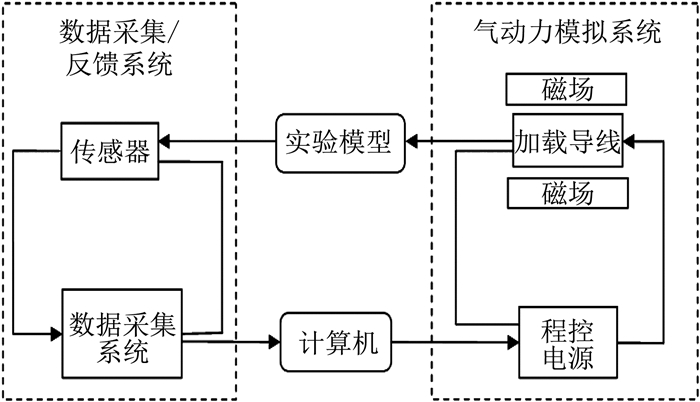 1 试验原理和试验方法电磁干风洞实验装置[11-12]是利用闭合的气动弹性实验系统对试验模型进行加载的方法,实验的基本原理如图 1所示。