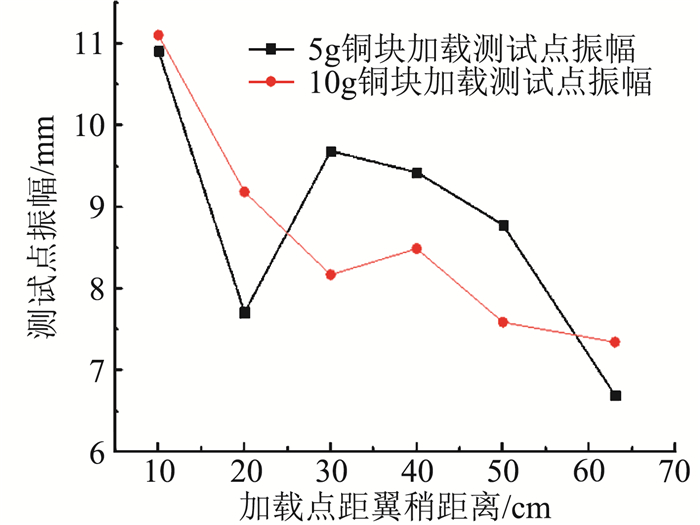 2) 将5 g质量块上粘贴双面胶,粘贴在模型不同的部位。利用激光位移传感器测量距模型根部195 mm的测试点A的位移变化。