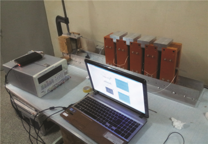 气动力发生系统中的程控电源将根据计算机所发出的指令对加载导线输出相应大小的变化电流。根据安培定理,通电导线在磁场下将承受安培力的作用,安培力的大小与电流强度成正比,由于模型和加载导线之间相互固定,并位于均匀磁场之中,这也将引起对模型加载力的实时变化。在模型不同位置粘贴加载导线,可以使模型实现模型在不同变形条件下所应承受“气动力”的实时变化,在变化的加载力下,模型又将产生新的变形,变形再被传感器测量,从而建立闭合的气动弹性试验系统。图 2为实验设备的实物图。