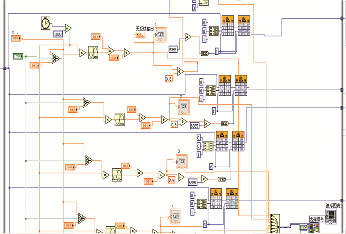 在该试验系统中,计算机起到关键的连接作用,在计算机中将编写控制程序实现数据采集和系统控制。基于Labview编写控制数据采集软件,该软件具有系统控制、运算、发出电流输出指令、接收发馈信号、存储采集信号等多项功能。图 3所示为部分主程序框图。