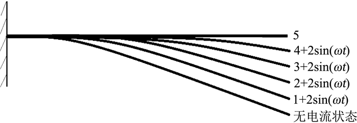 在无电流状态下,模型端部的最大挠度约为12 cm,在施加电流强度为1 A、2 A、3 A、4 A、5 A的电流时,模型端部的最大挠度分别约为9.6 cm、7.2 cm、4.8 cm、2.4 cm, 0 cm。
